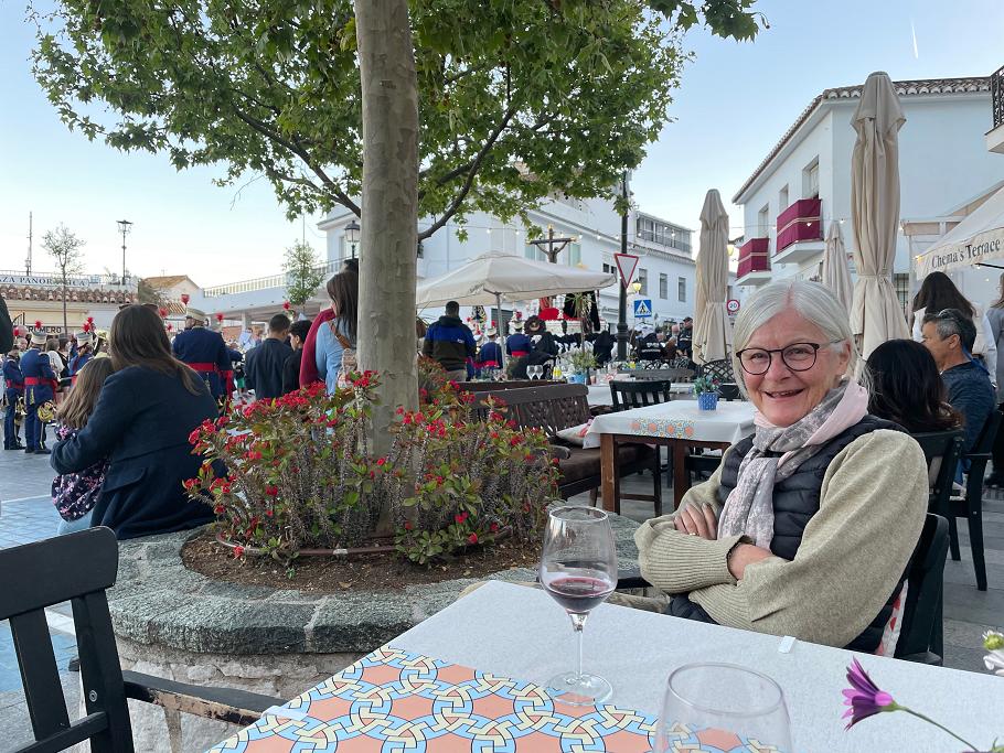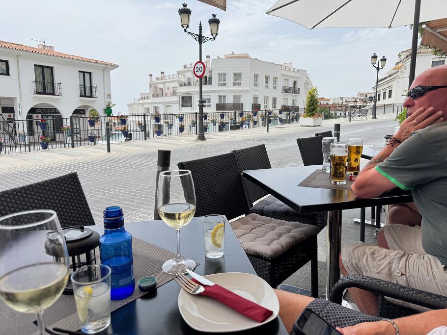 Chema's Terrace på Plaza de la Paz med hovedgaden gennem Mijas Pueblo yderst til venstre. Der er ofte levende musik her om aftenen i weekenden.