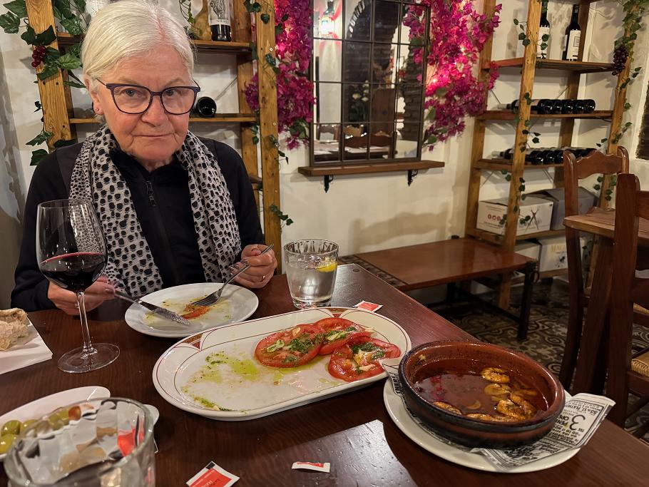 Anden gang spiste vi en glimrende på Amor a Málaga, her forretterne gambas pil-pil samt tomatsalat med masser af friske hvidløg. Fiskehovedretten var også fin.