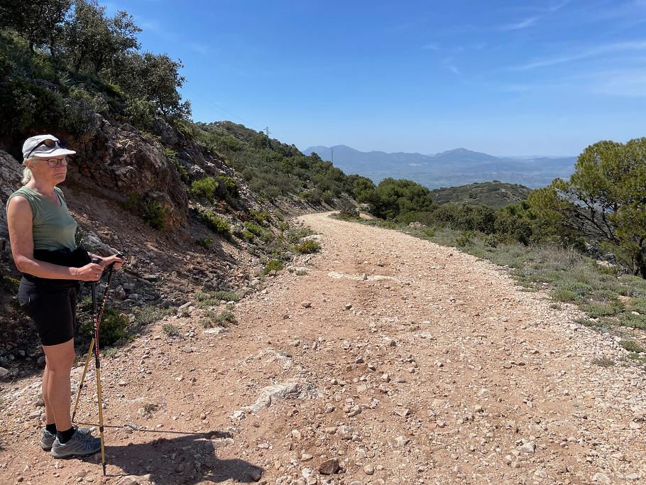 Vi gik væk fra grusvejen Pista Arenales ad en mindre vandresti, der fulgte grusvejen på nordsiden hen til kort efter Pista Arenales deler sig i to, Carril Nuevo på sydsiden af Sierra de Mijas (oven for Mijas Pueblo) og Pista Chaparral på nordsiden (mod Alhaurin el Grande). PS: Denne afstikker anbefales ikke lige i øjeblikket, hvor dette område blev brændt af i juli 2022. Følg i stedet grusvejen. Den kan man stadig se, modsat denne sti.