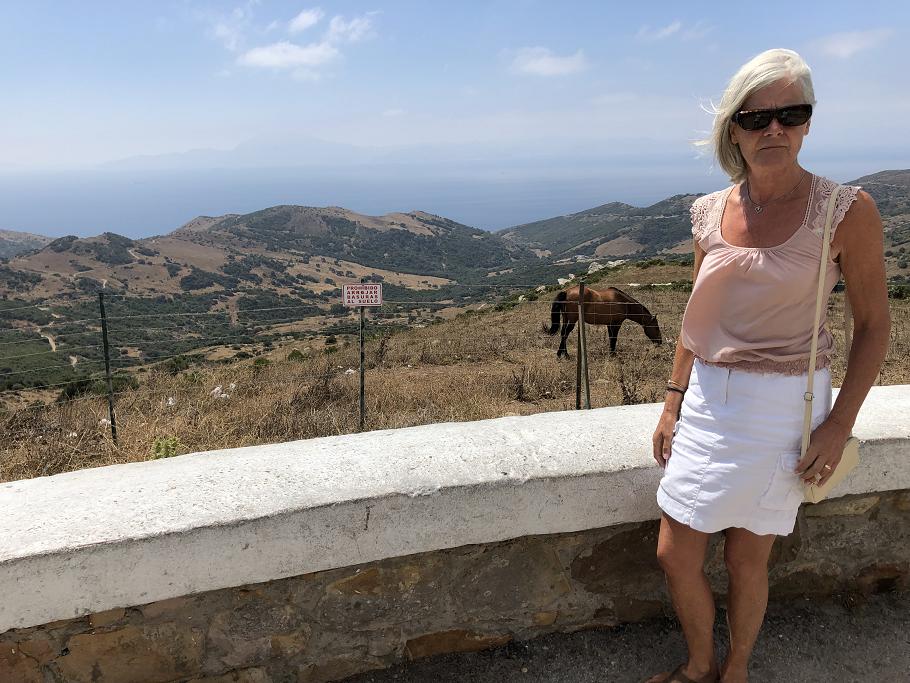 Birgitte i et tårn på fæstningen med fin udsigt over Gibraltarstrædet til Marokko i Nordafrika.