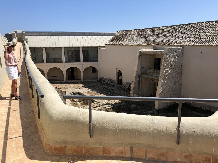 Ruiner og udgravninger inde i fæstningen og Birgitte oppe på en restaureret gang langs fæstningsmuren.