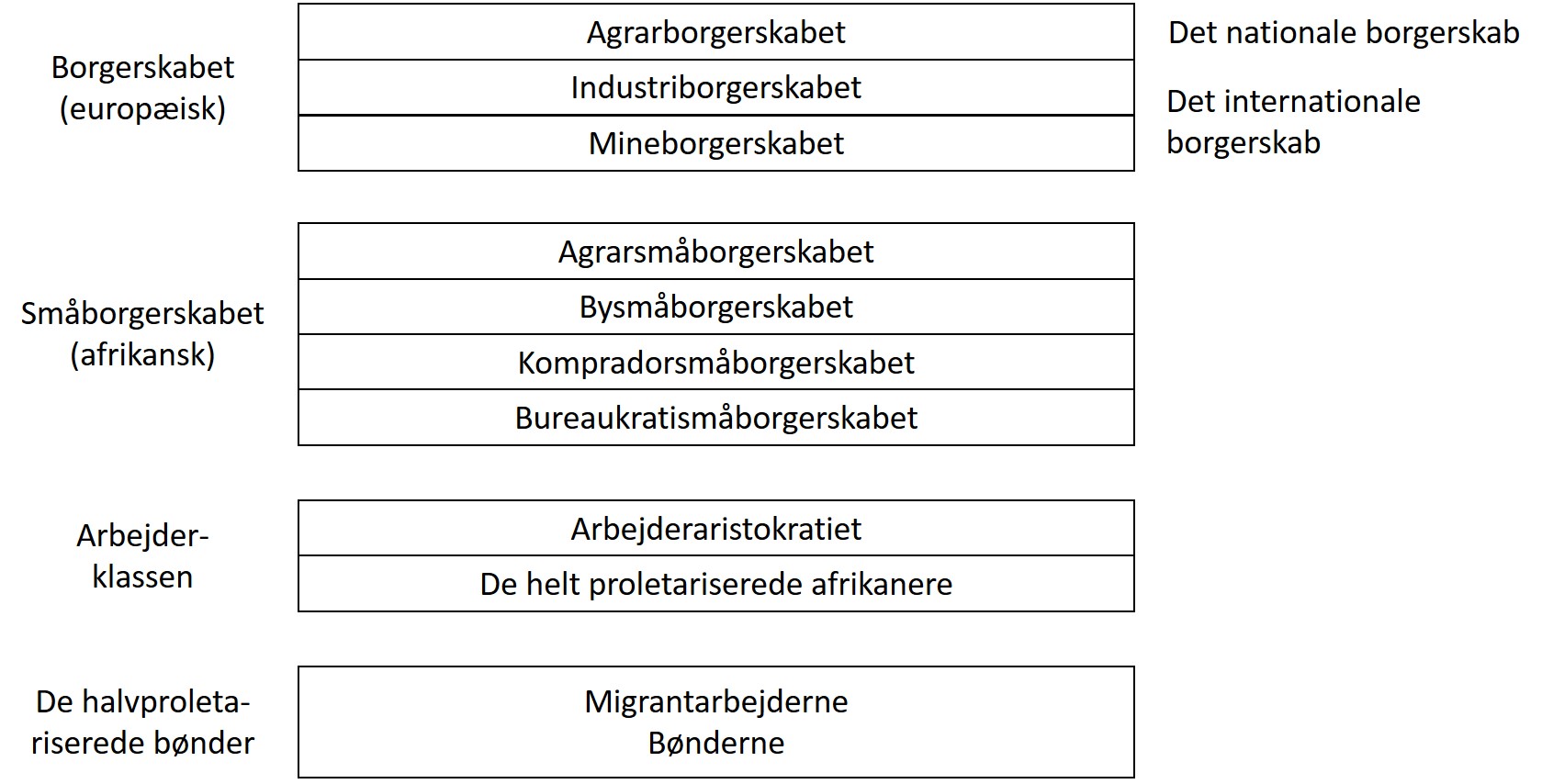 Med udgangspunkt i en opdeling af den kapitalistiske produktion i 3 hovedsektorer - minesektoren, det kapitalistiske landbrug og industrien - er der tre fraktioner inden for borgerskabet, der på forskellige tidspunkter siden koloniseringen har spillet en selvstændig rolle. Det drejer sig om mineborgerskabet, agrarborgerskabet og industriborgerskabet. Grundlaget herfor har været interessemodsætninger, der er udsprunget af forskellige akkumulationsbetingelser i de tre sektorer, som danner basis for de pågældende borgerskabsfraktioner.